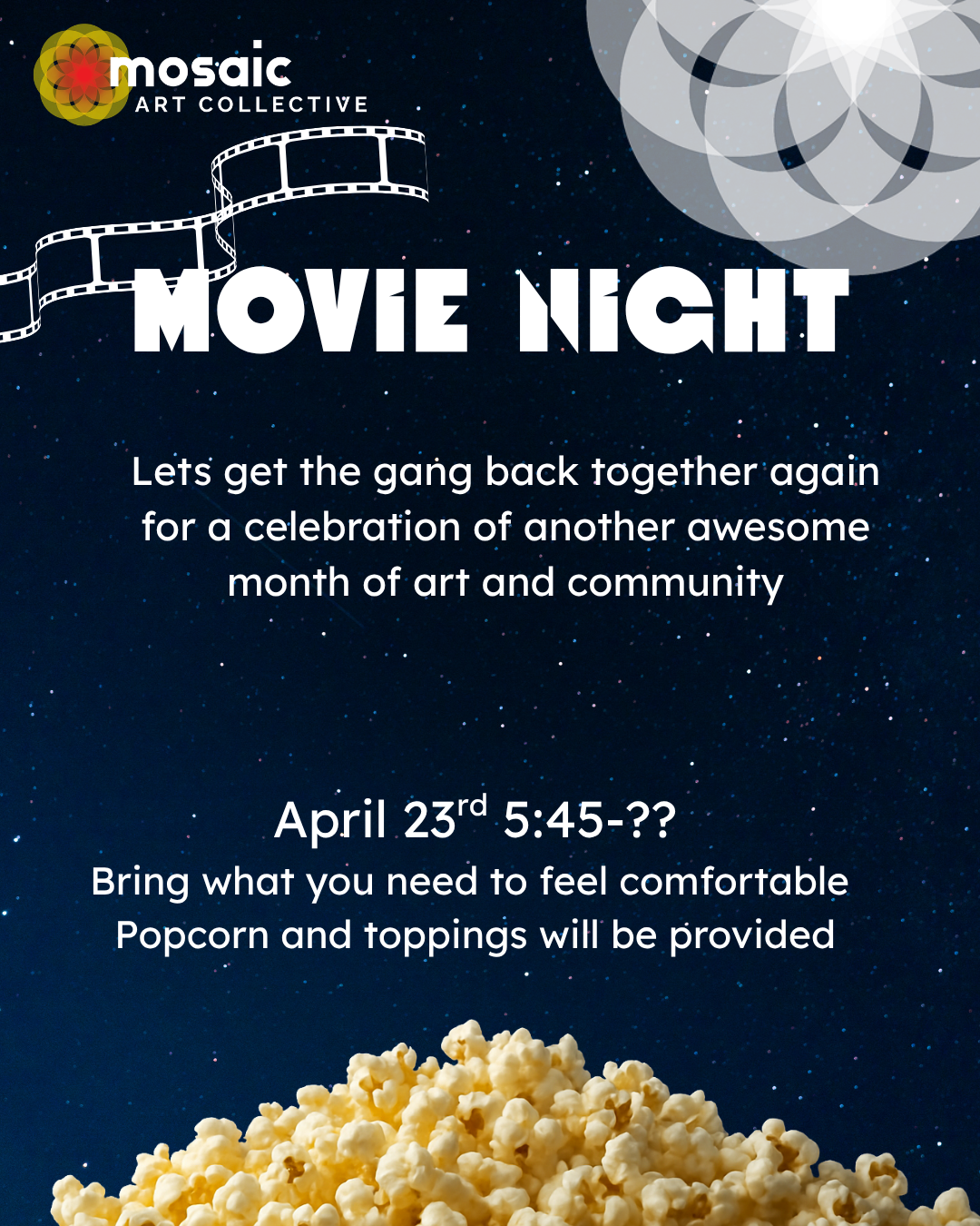 Another incredible month of art and community deserves a proper sendoff. Join us for a night of creativity, connection, and our first ever Movie Night in the gallery! And yes — gourmet popcorn bar included.
