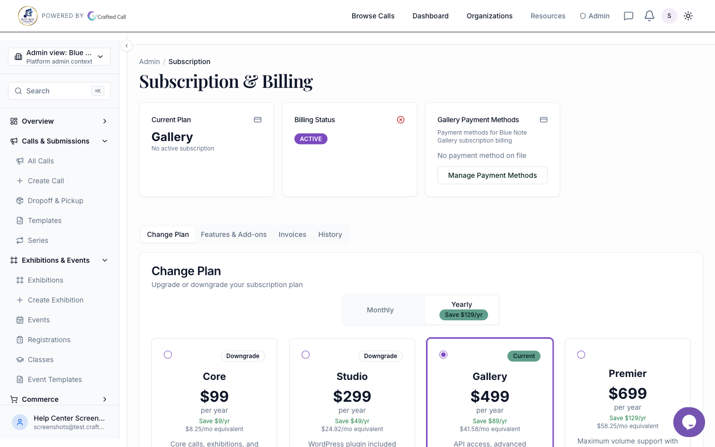 Example: A 5 MB artwork image uses 5 MB of storage. A 500-submission call with 3 images each uses ~7.5 GB.